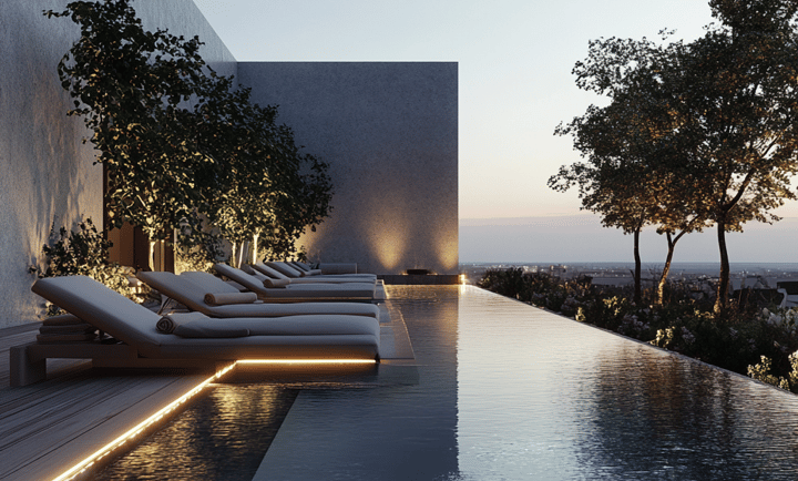 Si piensas que una piscina necesita luces de todos los colores del arcoíris, te tenemos noticias: no. La iluminación minimalista busca crear ambientes relajantes y sofisticados con la cantidad justa de luz.