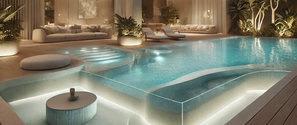 SEO Focus: piscina con zona chill out, diseño multifunción para piscinas, extras para piscina de lujo.